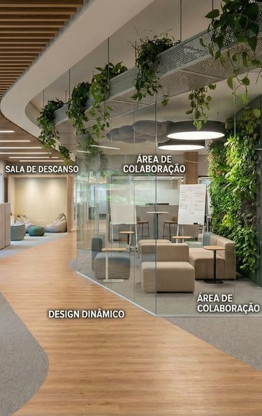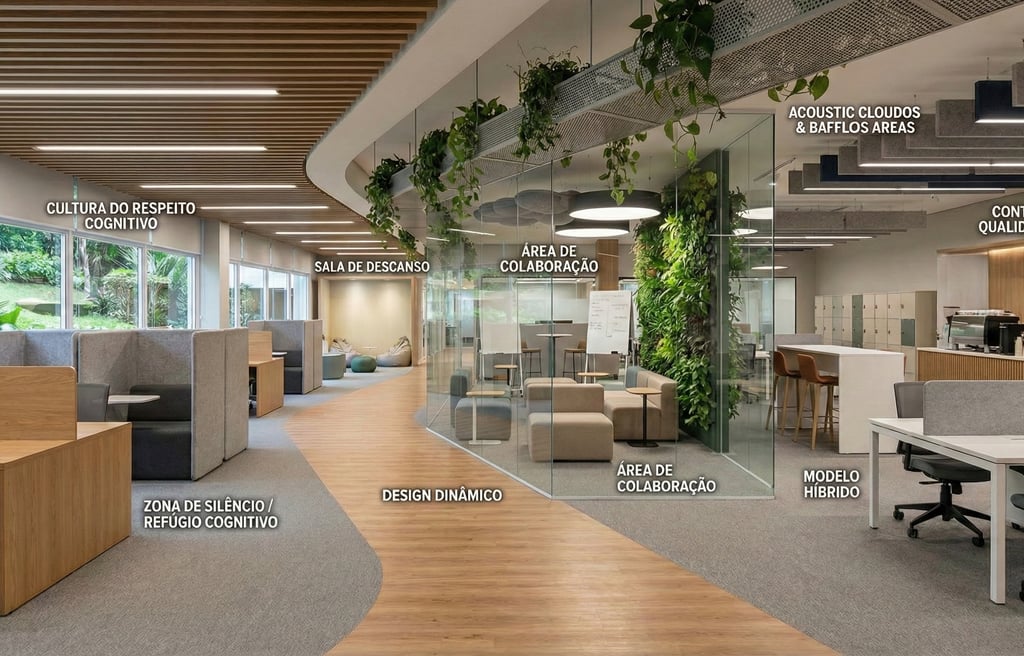 Invista em design acústico inteligente com painéis absorventes de som, divisórias estratégicas, carpetes e materiais que reduzem reverberação. Pequenas mudanças na acústica podem reduzir significativamente o ruído percebido e criar ambientes mais adequados para diferentes tipos de trabalho.